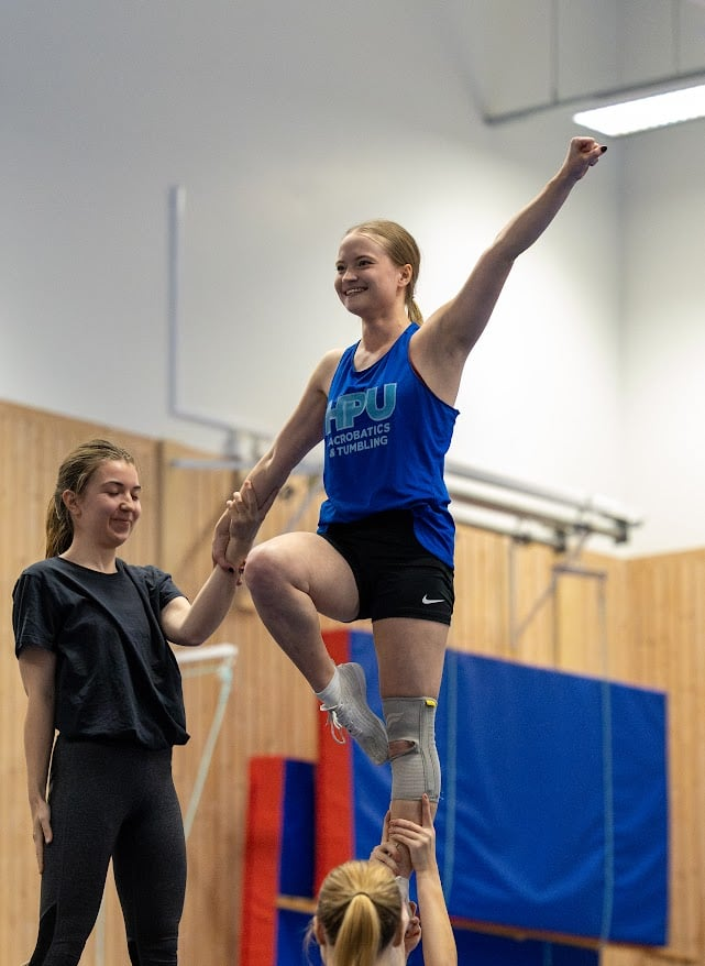 – Jag skulle säga att det är blandat med föreläsningar, projektarbeten, möten med klubbar och föreningar, cheerleadingträningar och studentuniversitetslandslaget. Utöver landslagshelgerna försöker vi ses i våra stuntgrupper så man hinner köra ihop sig med de man ska tävla med sedan.